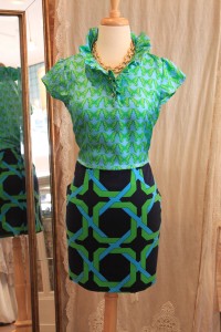IMG_1803 Keeping the Elizabeth McKay skirt, the look is lightened with this silk shirt by Elizabeth McKay in the butterfly print. This one has pretty, feminine cap sleeves, but the shirt is also available with no sleeves and long sleeves. The neckline has a lovely ruffle and french-cuff style buttons. Note that the green and blue in this shirt isn’t an exact match with those in the skirt, but as an ensemble, the pieces look as if they were made to go together!