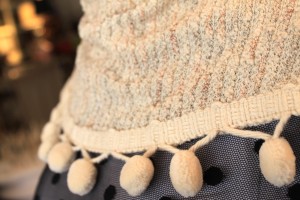 This casual fun look is perfect for hanging out, shopping, and enjoying the company of friends. Comfortable and stylish, it showcases pattern and texture in a neutral palette. The Sara Campbell pants are topped with a sheer dot top by Comfy. The top is folded along the bottom, and is actually quite long. It can be worn with a variety of looks. Underneath is a basic tee shirt. If you were so inclined, a bright color could be a great choice for an undershirt with this sheer top; Mark opted for white here to keep this look more neutral. The shawl piece is a ruana by Sara Campbell, turned backward. The pompom tassels echo the print and pattern of the other items. The texture of the ruana is nubby and so soft! The final piece is a Spartina handbag, which complements the taupe colors and round shapes in the ensemble. This outfit would look great with a casual flat shoe in another neutral tone.